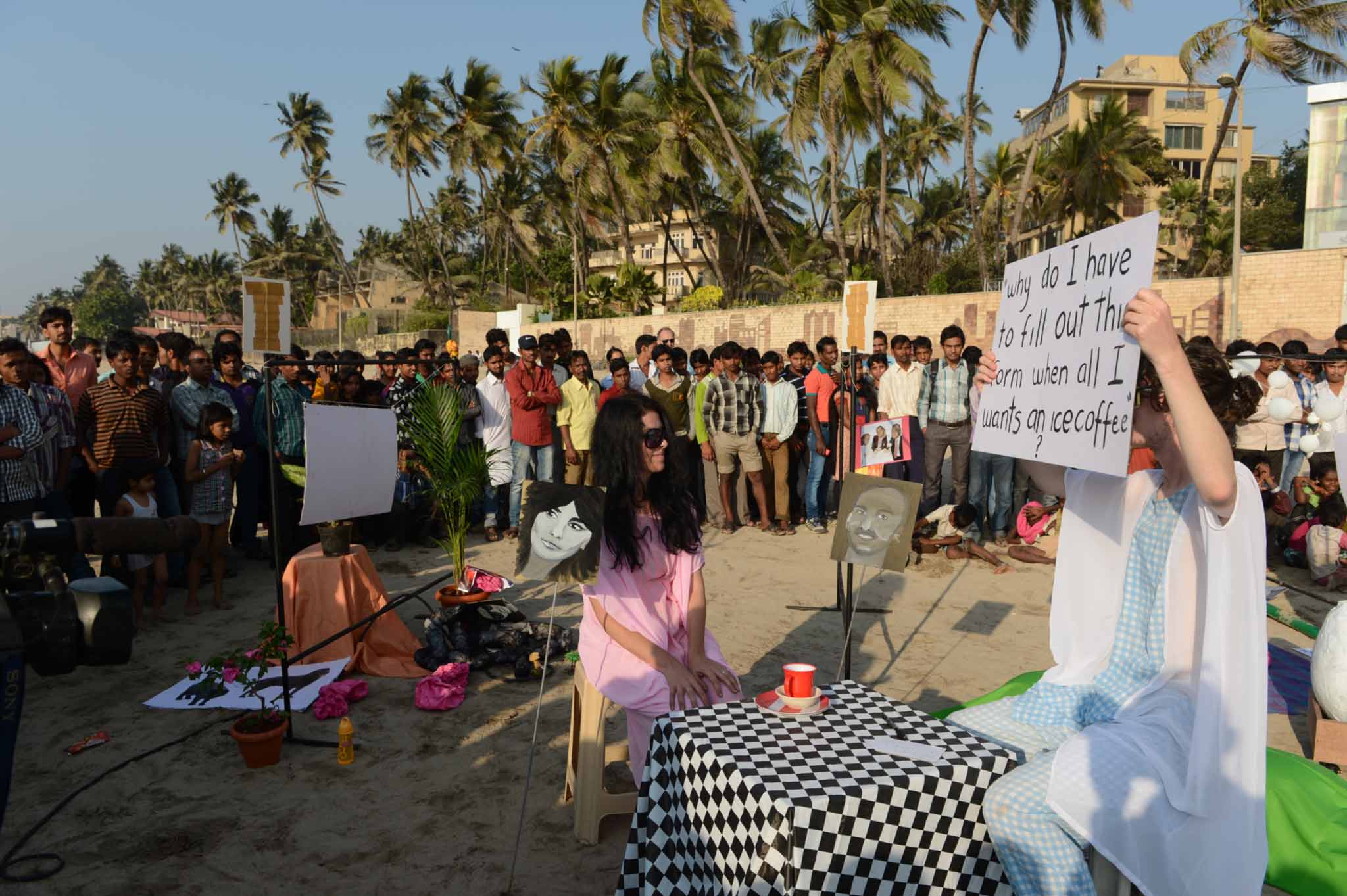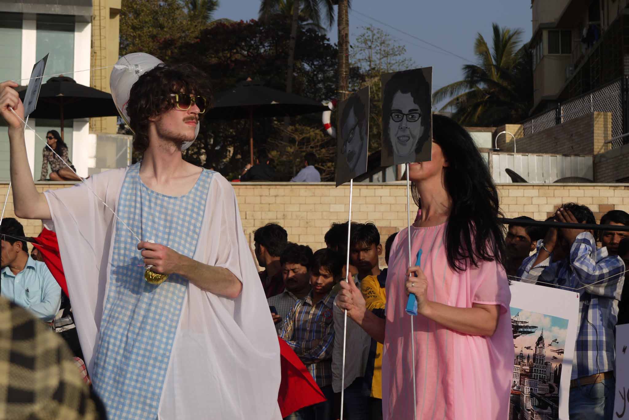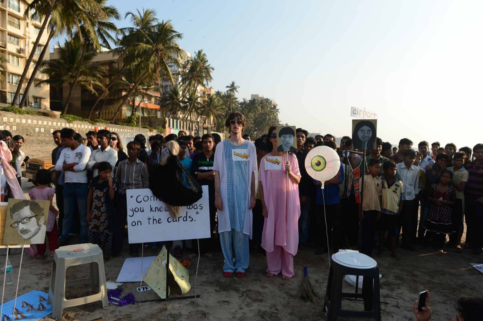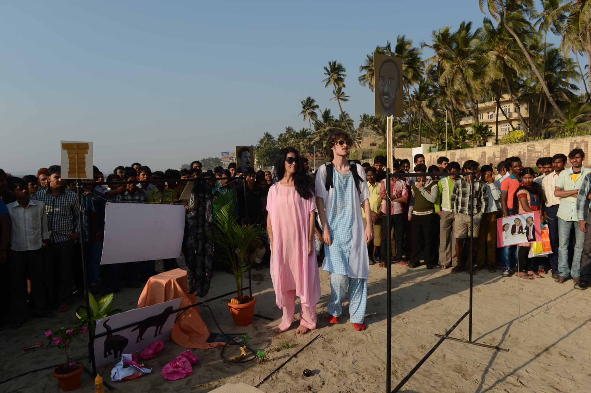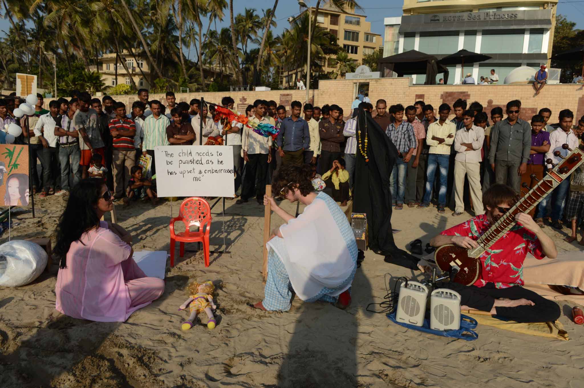 The Telepathy Project developed a process-based performance, exploring alternative routes, dream and telepathic communication. The absurdist, rambunctious and whimsical Dreaming the Arabian Sea featured Sean and Veronica acting out a series of vignettes inspired by the dreams that the pair had during their stay in India, presented at sunset on Juhu Beach, facing out to the Arabian Sea.